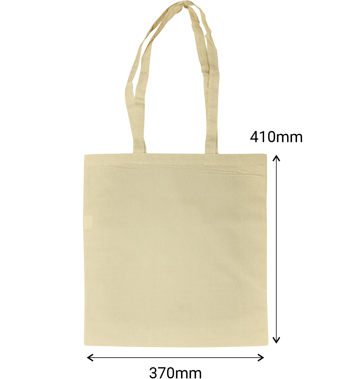 Our budget friendly Natural Calico Tote Bags are 37cm wide x 41cm high with two long handles. Handles are approximately 35cm from the top-centre of bag to top-centre of handles. Handle straps are 2.5cm thick. Made from 130gsm, 100% cotton with cross stitched inside seams for strength.