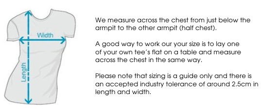 FIT: Regular fit - please check the size chart to avoid disappointment. Lay your own tee flat on a table, measure armpit to armpit across the chest and match to the size you feel is best. Please note measurements can vary within 2.5cm, this is within the accepted tolerance.