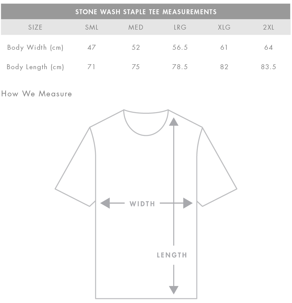 FIT: Regular fit - please check the size chart to avoid disappointment. Lay your own tee flat on a table, measure armpit to armpit across the chest and match to the size you feel is best. Please note measurements can vary within 2.5cm, this is within the accepted tolerance.