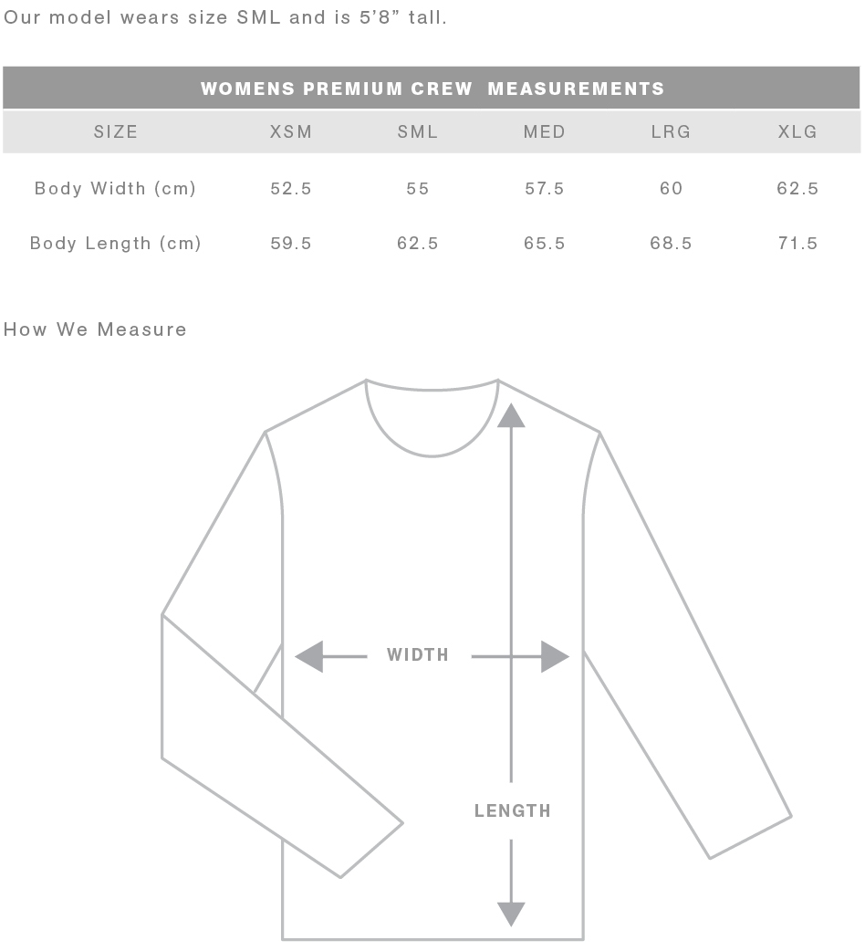 FIT: Relaxed fit - please check the size chart to avoid disappointment. Lay your own tee/sweater flat on a table, measure armpit to armpit across the chest and match to the size you feel is best. Please note measurements can vary within 2.5cm, this is within the accepted tolerance.
