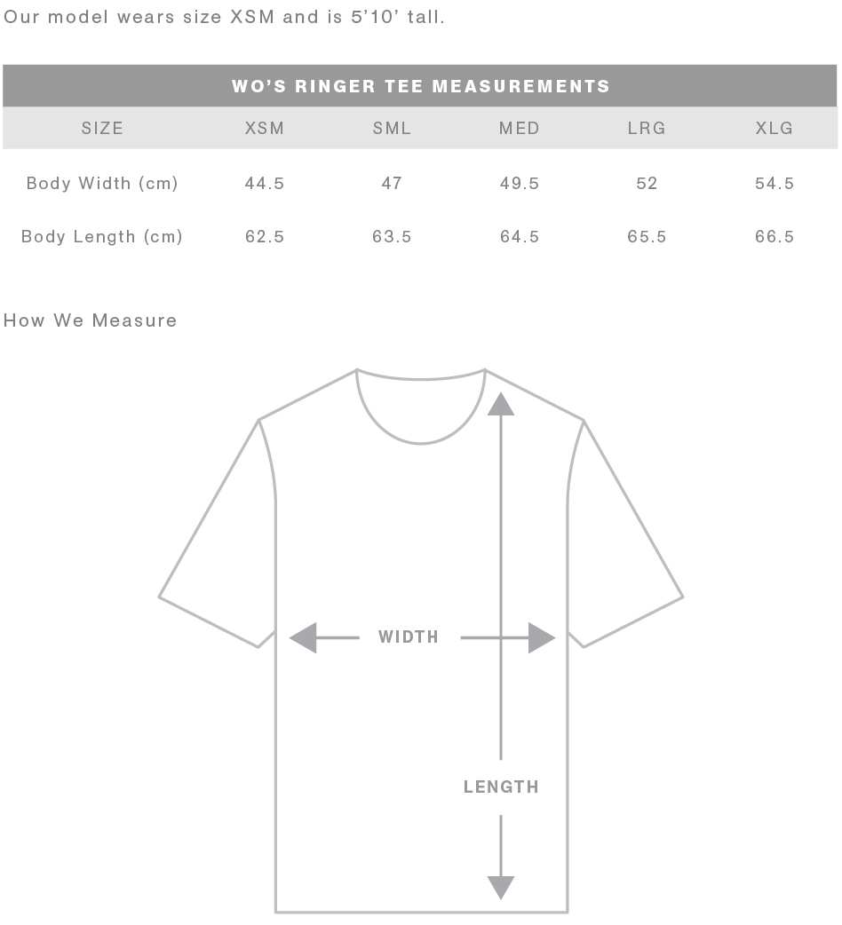 FIT: Regular fit - please check the size chart to avoid disappointment. Lay your own tee flat on a table, measure armpit to armpit across the chest and match to the size you feel is best. Please note measurements can vary within 2.5cm, this is within the accepted tolerance.
