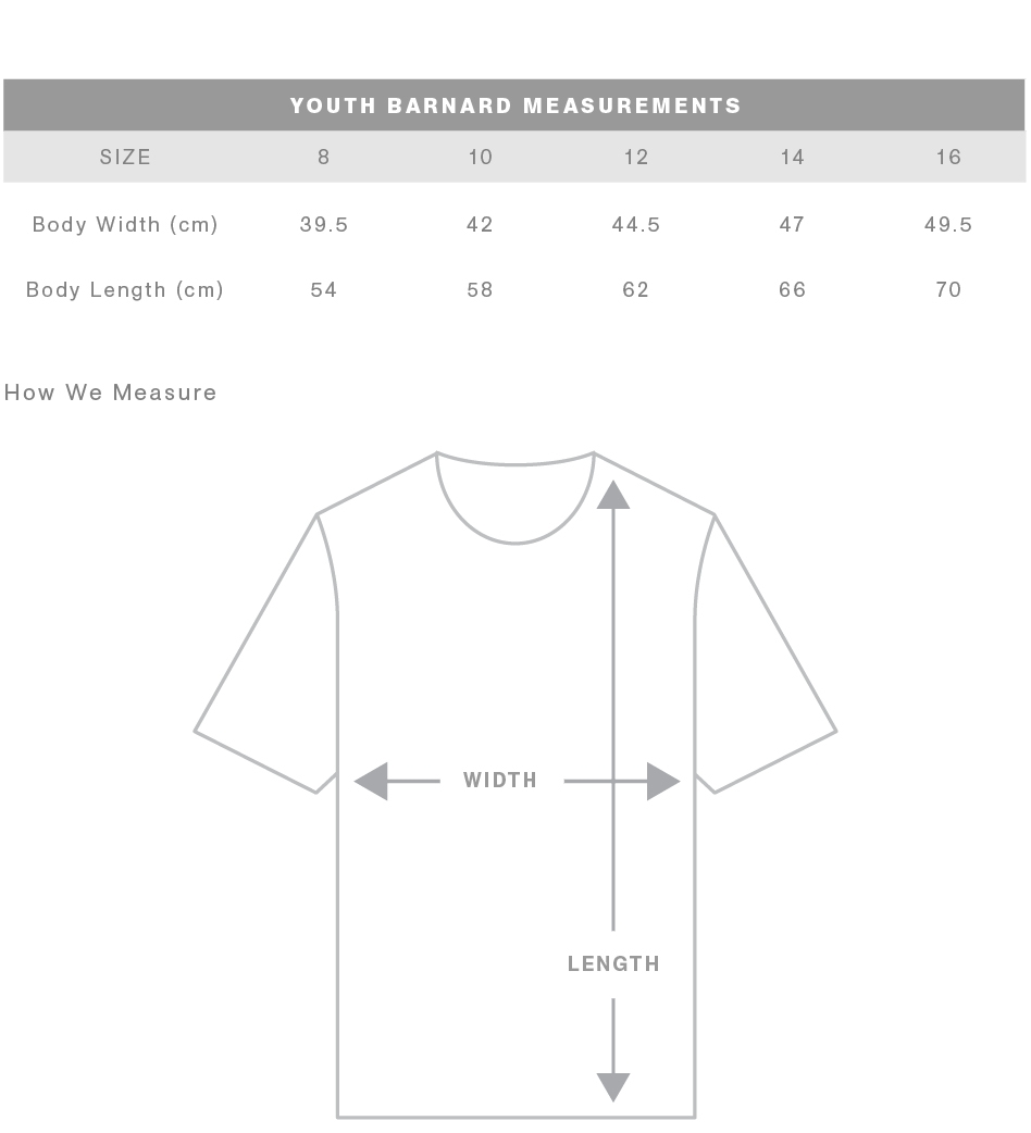 FIT: Regular fit - please check the size chart to avoid disappointment. Lay your own singlet/tee flat on a table, measure armpit to armpit across the chest and match to the size you feel is best. Please note measurements can vary within 2.5cm, this is within the accepted tolerance.
